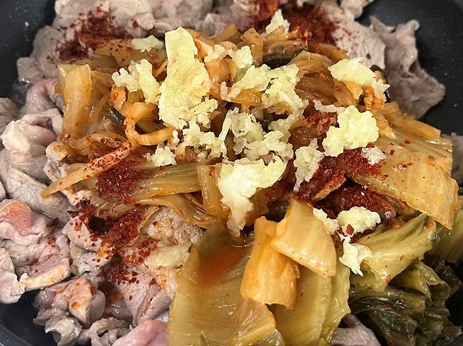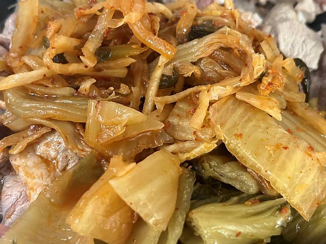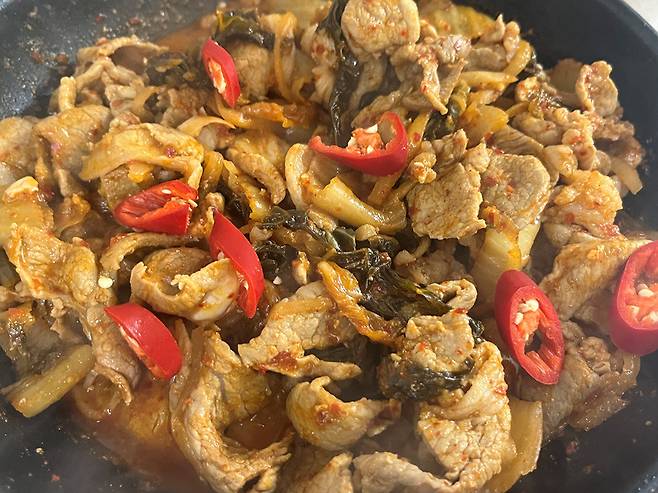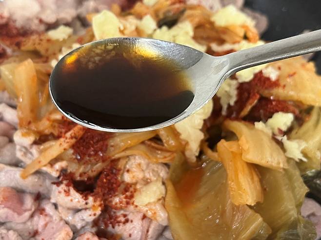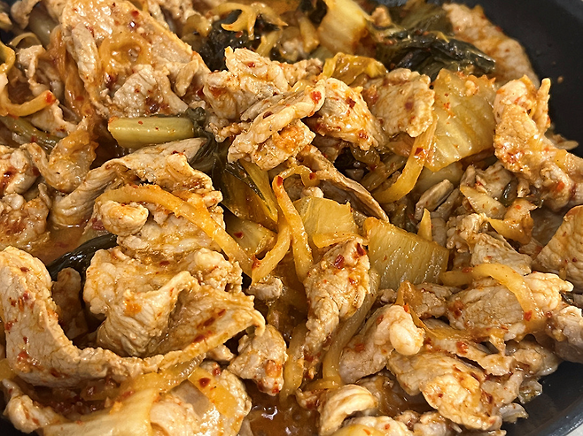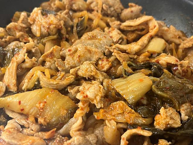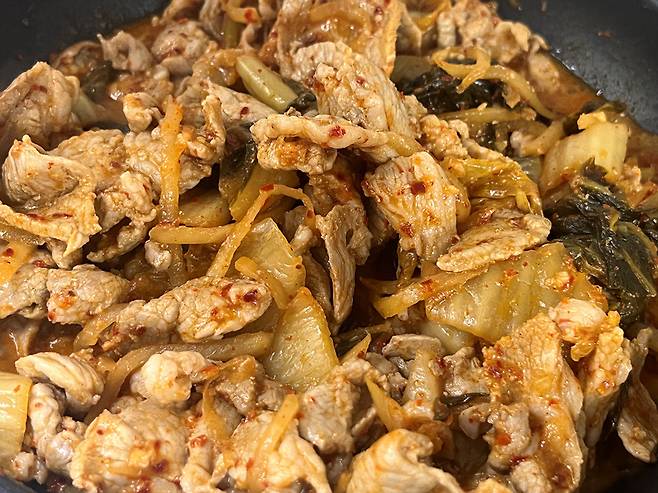 이렇게만 만들면 양념 많이 하지 않고도 맛있는 제육볶음 만들 수 있습니다. 김치를 넣어서 빠르고 골고루 볶아내는 것이 핵심입니다. 국물이 많다면 마지막에 강불로 올려 양념을 졸이세요.