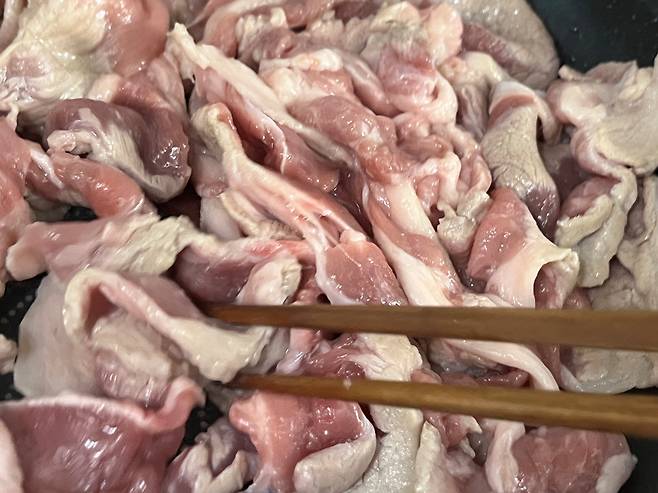 제육처럼 비교적 얇은 고기를 볶을 때는 골고루 빠른 시간 내 익히는 것이 중요한데요. 고기가 얇기 때문에 오래 볶으면 질겨지고, 수분이 빠져 퍽퍽해질 수 있기 때문입니다. 고기를 계속 섞어가며 복아 주세요.