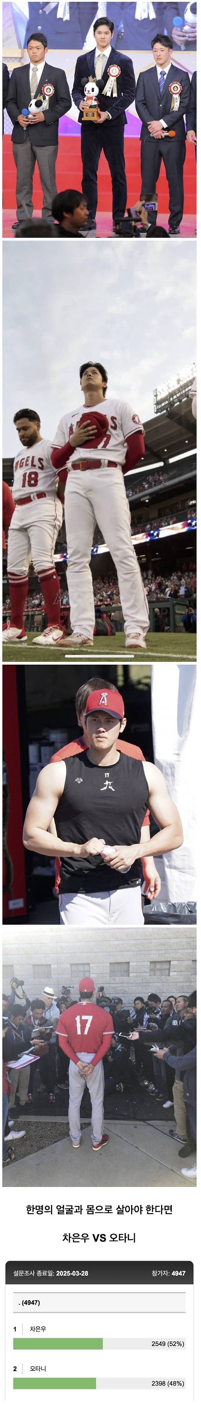 설문에는 총 4947명이 참여했으며, 차은우가 52%로 근소하게 1위를 차지했고 오타니가 48%로 뒤를 이었다.