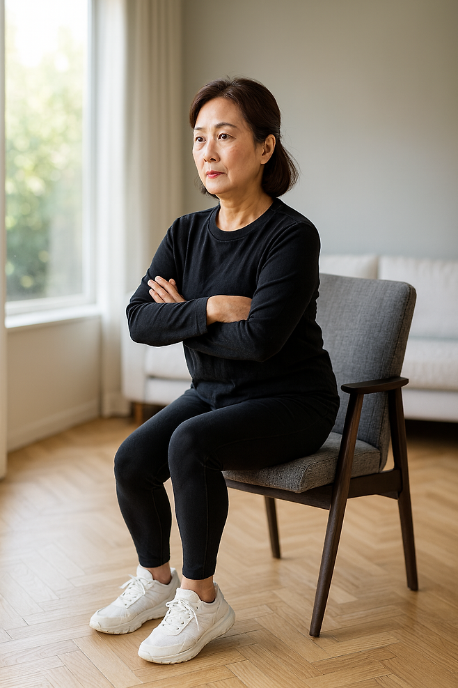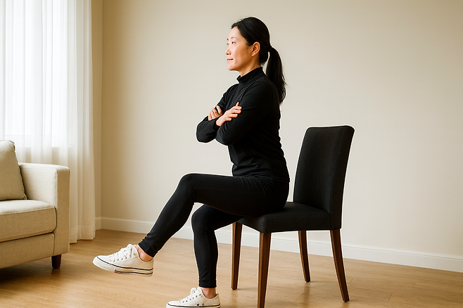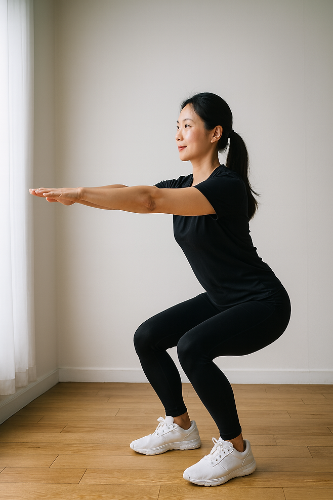 • 월·수·금 : 의자 스쿼트 8~12회×2세트(손은 가슴 앞, 천천히 앉았다 일어서기).