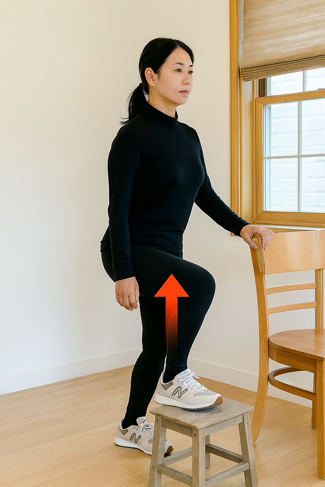 • 화·목 : 스텝업 6~10회×2세트(낮은 계단이나 단상, 무릎이 아프면 높이를 낮춰요).