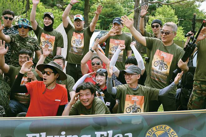 ‘날으는 벼룩’이라는 뜻의 플라잉 플리(Flying Flea)는 2차 세계대전을 치르는 영국군 공수부대원의 빠른 이동을 지원하기 위해 로얄엔필드가 제작한 초경량 모델의 WD의 별명이다. 59kg의 가벼운 무게에 2스트로크 126cc엔진을 장착했다. 더 플라잉 플리 데이는 이 모델의 이름에서 따온 밀리터리 콘셉트의 캠핑 행사다. 로얄엔필드 바이크는 플라잉 플리 뿐만 아니라 실제로 영국은 물론 벨기에와 미국, 프랑스, 심지어 러시아의 군용 제식으로 채택되었을 만큼 군대와의 연관성이 많다. 심지어 로얄엔필드의 슬로건은 ‘Made Like A Gun’이다. 지난해에 1회 이벤트부터 뜨거운 반응을 얻고 올해는 그 규모를 키워서 60여명의 엔필더와 함께 더욱 즐거운 행사가 되었다.