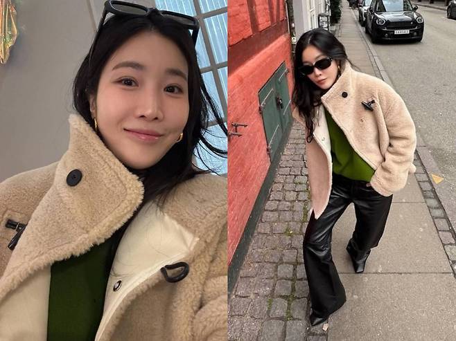 따뜻한 무드의 베이지 컬러 시어링 재킷에 깊은 녹색 니트를 매치해 차분하면서도 고급스러운 분위기를 연출했습니다.