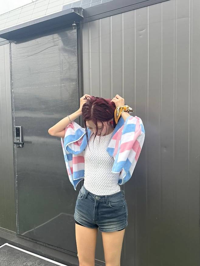 포인트는 악세서리에 있었다. 손목에는 러플 디테일이 들어간 실크 스카프를 감아 리조트 무드를 더했고, 길게 웨이브진 핑크빛 헤어는 전체 스타일에 생기를 불어넣었다. 베이직한 스니커즈로 마무리한 룩은 활동성과 스타일을 동시에 잡았다.