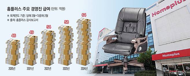 홈플러스는 자체 회계연도 기준 △2020년 46억 원 △2021년 49억 원 △2022년 54억 원 △2023년 58억 원 △2024년 64억 원 등 꾸준히 경영진 급여를 인상해 왔다. 특히 2024년 경영진 급여는 홈플러스 영업이익이 적자전환한 시기인 2021년 회계연도 대비 약 31% 늘어난 수준이다.