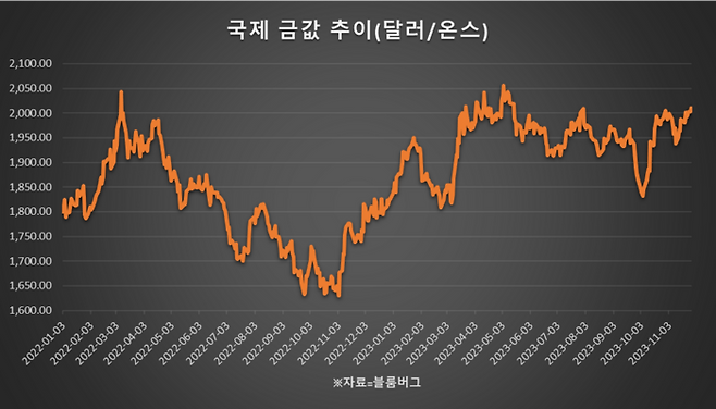 국제 금값은 지난해 9월 연준의 급격한 금리 인상이 이어지던 당시 온스당 1614.96달러로 저점을 기록했다가 올해 5월 2062.99달러까지 반등한 뒤, 재차 10월 초까지 1810.51달러로 내려가는 등 높은 변동성을 기록했다.
