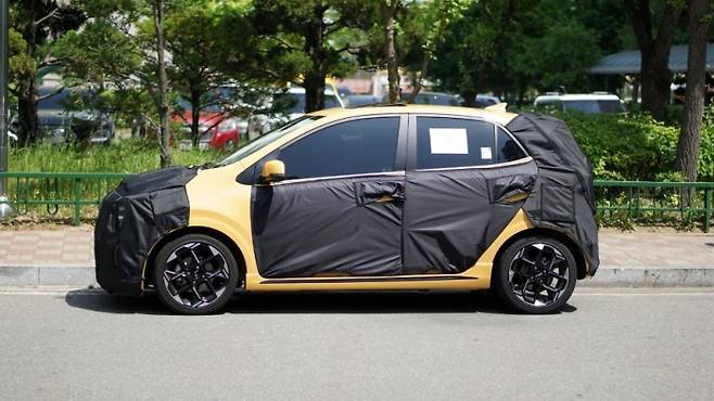 기아는 과거에도 허니비(꿀벌)색 모닝을 선보인 적이 있는데, 당시 선보였던 허니비 색깔보다 더 고급스러운 노란색이다. 모닝의 독특한 색깔은 B필러에서도 확인이 가능하다. 위장막을 씌우지 않은 부분은 모두 노란색을 적용했는데, 유독 B필러만 무광 검은색을 적용했다.