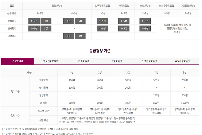 사업자가 평가를 신청하면 공사에서 직접 현장을 찾아 보안, 주차, 시설, 조경, 객실면적 등 다양한 항목에 직접 점수를 매기며 4성급 이상 호텔의 경우 손님으로 가장해 평가하는 암행평가 점수까지 포함해 최종 등급이 결정된다고 합니다.