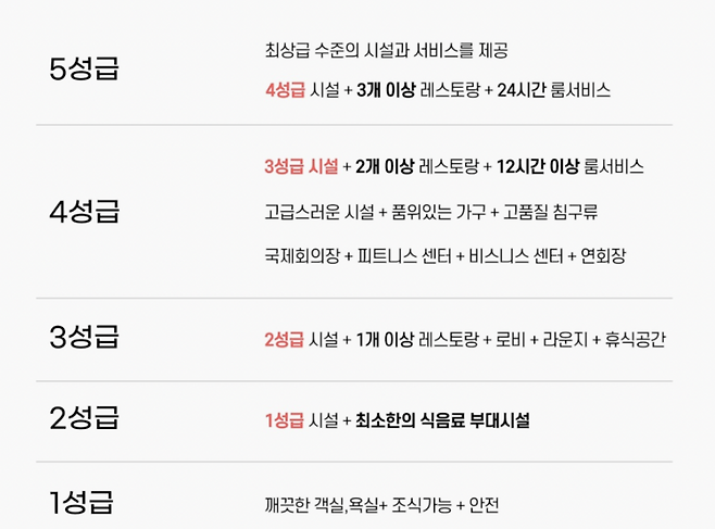 즉, 고급스러운 인테리어와 디자인 등으로 호텔 등급이 구분되는 것이 아닌 필요한 시설과 서비스를 갖추고 있는지, 어메니티의 수준은 어떤지로 등급을 정하지 디자인의 감도로 분류하는게 아닙니다. 그래서 무조건 5성급이라고 해서 다 좋은 것도 아니며 4성급이 3성급보다 퀄리티가 떨어질 수도 있다는 점 꼭 명심하세요.