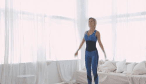 바닥에 선 자세에서 호흡을 정리하며 준비합니다. 점프와 동시에 발을 좌우로 벌리고, 두 팔은 머리 위로 올려 손뼉을 칩니다. 다시 점프하면서 발을 모으고, 두 팔을 몸 옆으로 자연스럽게 내립니다.