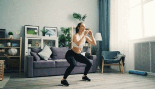 바닥에 선 자세에서 다리를 어깨너비보다 넓게 벌립니다. 엉덩이를 뒤로 빼며 무릎을 굽히고, 스쿼트 자세를 취합니다. 이때 두 팔은 몸 앞쪽으로 곧게 뻗어 균형을 잡습니다. 다시 일어날 때 팔은 몸 옆으로 내려줍니다.