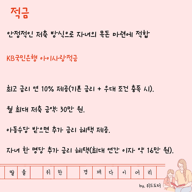 KB국민은행 아이사랑적금: 최고 금리 연 10% 제공(기본 금리 + 우대 조건 충족 시).