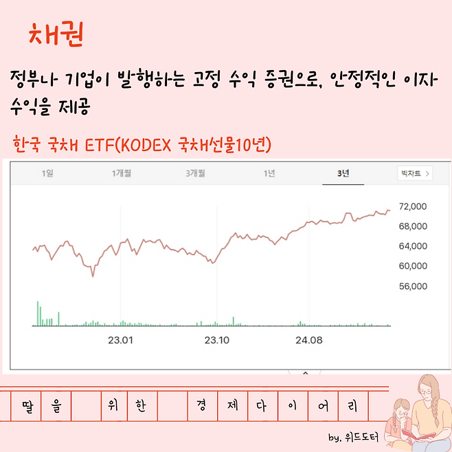 한국 국채 ETF(KODEX 국채선물10년): 국채에 간접 투자하며 안정적인 이자 수익을 기대할 수 있어요.