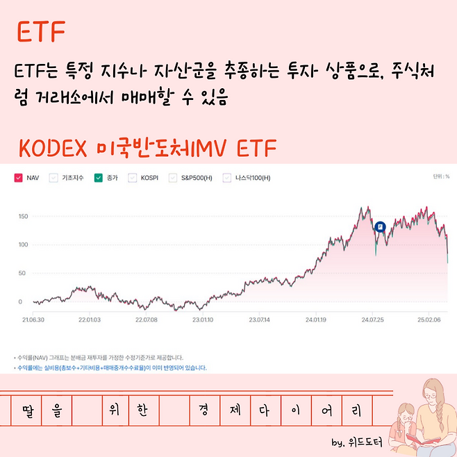 ETF는 특정 지수나 자산군을 추종하는 투자 상품으로, 주식처럼 거래소에서 매매할 수 있어요.