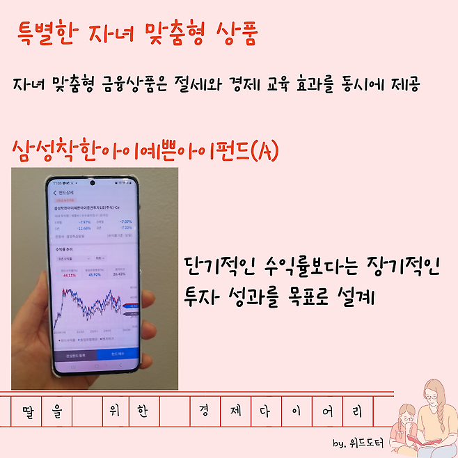 삼성착한아이예쁜아이펀드(A): 자녀의 미래를 위한 장기적인 목돈 마련에 적합한 상품으로 설계되어 있는데요.