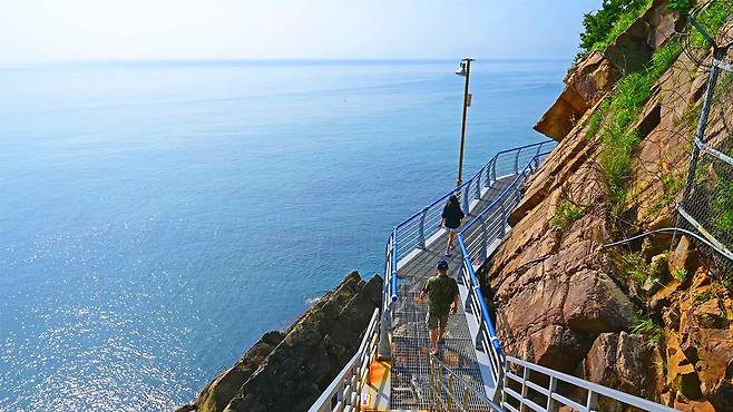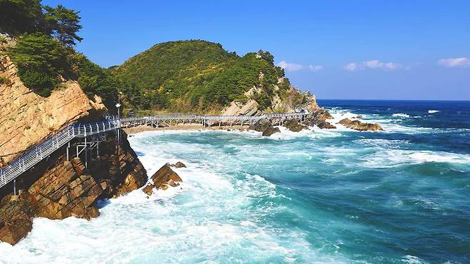 길을 따라 걷다 보면 투구바위, 부채바위 등 기묘한 암석들이 등장하고, 발아래로는 동해의 파도가 손에 잡힐 듯 가까이 부서진다.