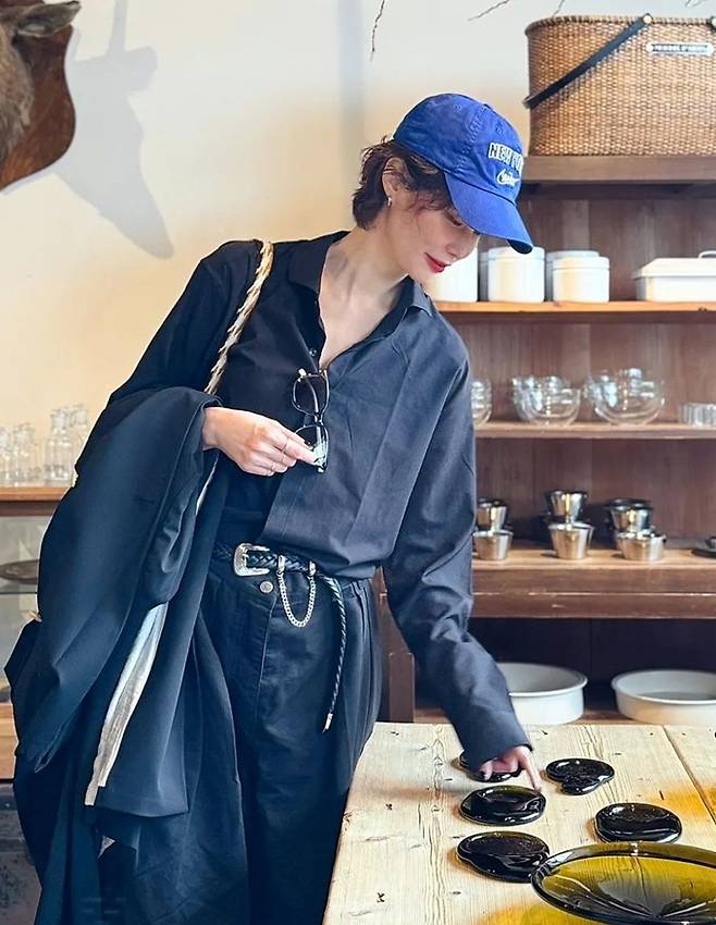 공개한 사진에서 송경아는 우월한 기럭지에 네이비 셔츠와 와이드 핏 팬츠를 입고 볼캡과 뿔테 안경을 매치한 스트릿룩으로 클라스 다른 모델 핏을 드러냈다.