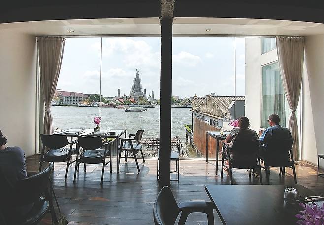 강변을 향한 의자에 앉아 왓 아룬을 바라보며 망중한을 즐길 수 있다. 시간에 관계없이 전망이 아름답다. 창가 좌석은 일주일 전에 예약할 것.