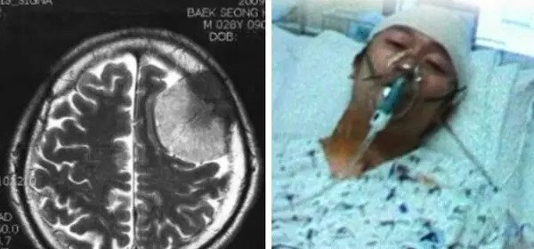 놀랍게도 빽가의 MRI 사진을 보니 종양이 뇌의 1/4을 차지하고 있었습니다.