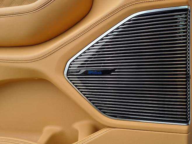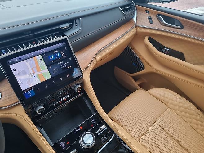 실내 인테리어는 리얼 나무무늬목으로 상당한 면적을 감쌌고 살결이 닿는 모든 곳에 고급스런 가죽을 모두 덮어 저택의 거실에 앉은 기분을 준다. 특히 2열은 좌판부터 널찍하고 푸근한 인상을 풍긴다. 커멜 컬러로 깨끗하면서도 최고의 시트 가죽질감이 예술이다.