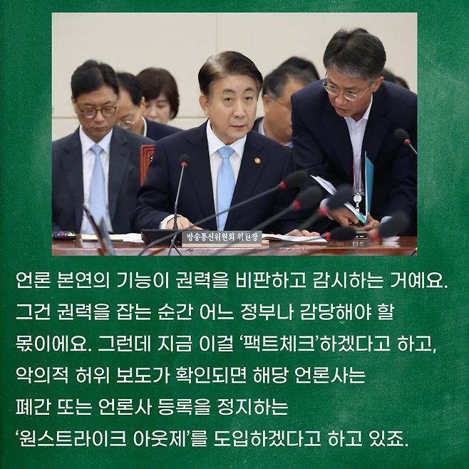 언론 본연의 기능이 권력을 비판하고 감시하는 거예요. 도가 지나치다고 생각할 수는 있겠지만, 그건 권력을 잡는 순간 어느 정부나 감당해야 할 몫이에요. 그런데 지금 이걸 ‘팩트체크’하겠다고 하고, 악의적 허위 보도가 확인되면 해당 언론사는 폐간 또는 언론사 등록을 정지하는 ‘원스트라이크 아웃제’를 도입하겠다고 하고 있죠.
