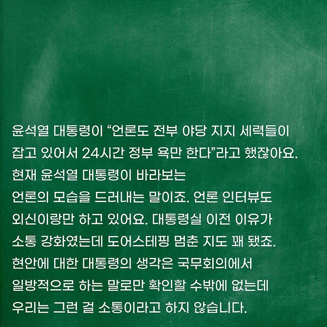 윤석열 대통령이 “언론도 전부 야당 지지 세력들이 잡고 있어서 24시간 정부 욕만 한다”라고 했잖아요. 현재 윤석열 대통령이 바라보는 언론의 모습을 드러내는 말이죠. 언론 인터뷰도 외신이랑만 하고 있어요. 대통령실 이전 이유가 소통 강화였는데 도어스테핑 멈춘 지도 꽤 됐죠. 현안에 대한 대통령의 생각은 국무회의에서 일방적으로 하는 말로만 확인할 수밖에 없는데 우리는 그런 걸 소통이라고 하지 않습니다.