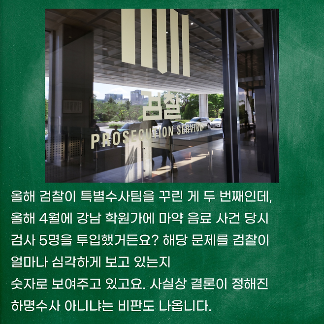 올해 검찰이 특별수사팀을 꾸린 게 두 번째인데, 올해 4월에 강남 학원가에 마약 음료 사건 당시 검사 5명을 투입했거든요? 해당 문제를 검찰이 얼마나 심각하게 보고 있는지 숫자로 보여주고 있고요. 사실상 결론이 정해진 하명수사 아니냐는 비판도 나옵니다.