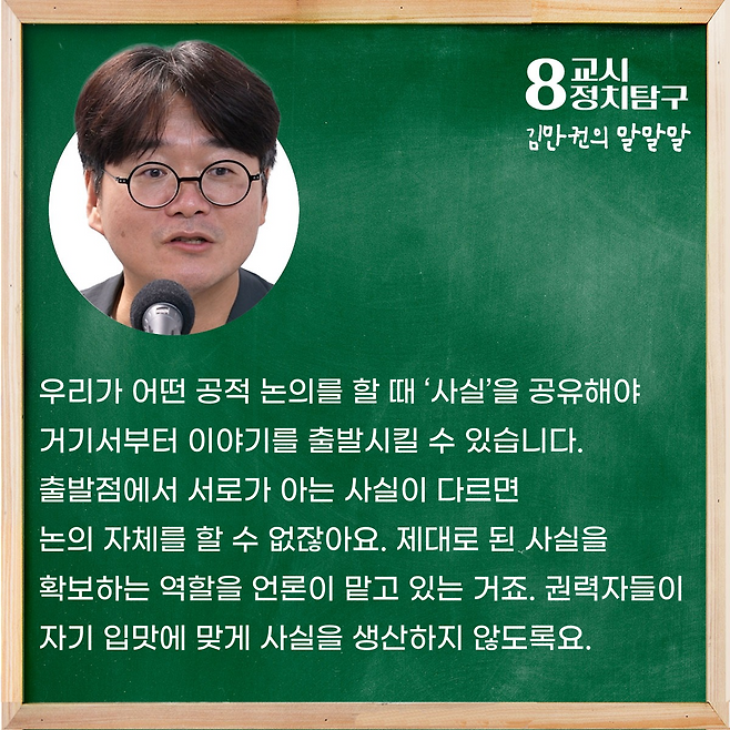 우리가 어떤 공적 논의를 할 때 ‘사실’을 공유해야 거기서부터 이야기를 출발시킬 수 있습니다. 출발점에서 서로가 아는 사실이 다르면 논의 자체를 할 수 없잖아요. 제대로 된 사실을 확보하는 역할을 언론이 맡고 있는 거죠. 권력자들이 자기 입맛에 맞게 사실을 생산하지 않도록요.