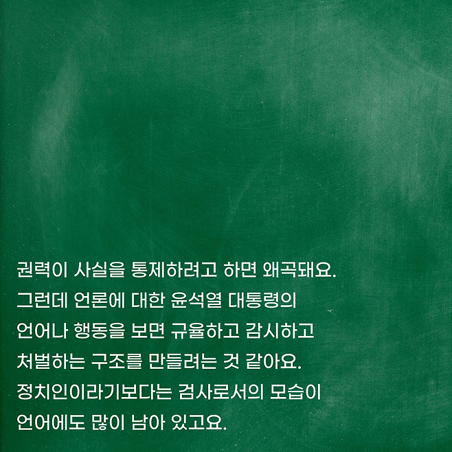 권력이 사실을 통제하려고 하면 왜곡돼요. 그런데 언론에 대한 윤석열 대통령의 언어나 행동을 보면 규율하고 감시하고 처벌하는 구조를 만들려는 것 같아요. 정치인이라기보다는 검사로서의 모습이 언어에도 많이 남아 있고요.