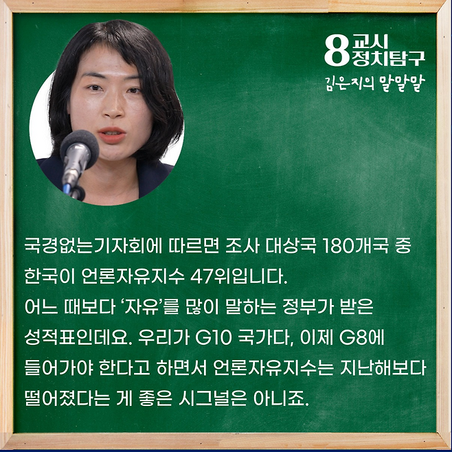 국경없는기자회에 따르면 조사 대상국 180개국 중 한국이 언론자유지수 47위입니다. 어느 때보다 ‘자유’를 많이 말하는 정부가 받은 성적표인데요. 우리가 G10 국가다, 이제는 G8에 들어가야 한다고 하면서 언론자유지수는 지난해보다 떨어졌다는 게 좋은 시그널은 아니죠.