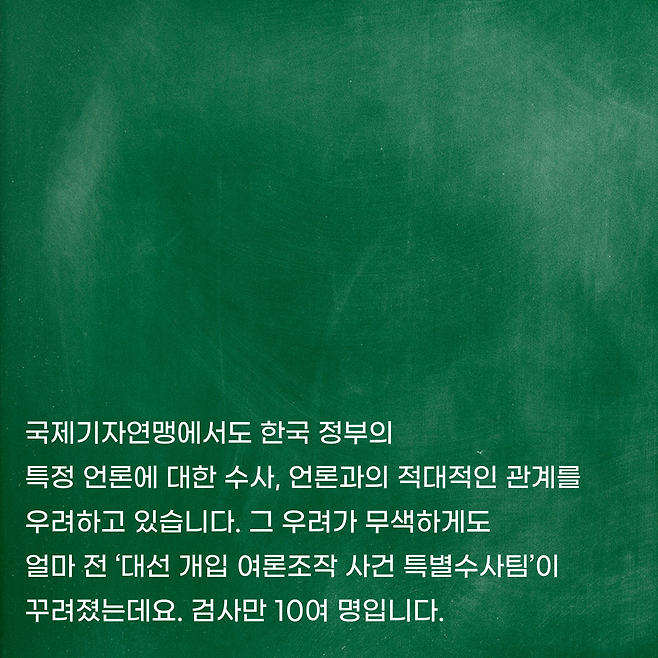 국제기자연맹에서도 한국 정부의 특정 언론에 대한 수사, 언론과의 적대적인 관계를 우려하고 있습니다. 그 우려가 무색하게도 얼마 전 ‘대선 개입 여론조작 사건 특별수사팀’이 꾸려졌는데요. 검사만 10여 명입니다.