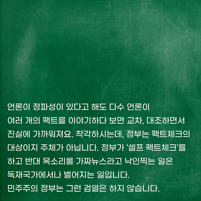 언론이 정파성이 있다고 해도 다수 언론이 여러 개의 팩트를 이야기하다 보면 교차, 대조하면서 진실에 가까워져요. 착각하시는데, 정부는 팩트체크의 대상이지 주체가 아닙니다. 정부가 ‘셀프 팩트체크’를 하고 반대 목소리를 가짜뉴스라고 낙인찍는 일은 독재국가에서나 벌어지는 일입니다. 민주주의 정부는 그런 검열은 하지 않습니다.