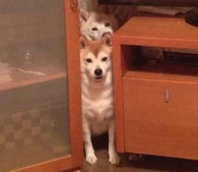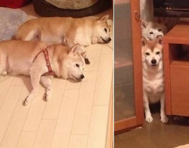 서랍장 사이 속으로 숨어 들어간 두 강아지는 얼굴만 내밀고는 집사를 뚫어져라 빤히 바라볼 뿐이었는데요.