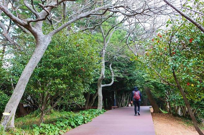 아직은 초록 잎이 감도는 시기이지만, 울창한 동백 숲이 만들어내는 터널을 걷는 것만으로도 충분히 고요한 분위기를 느낄 수 있다. 햇살이 나뭇잎 사이로 스며들며 길 위에 부드럽게 내려앉는 순간은 계절과 상관없이 오래 기억에 남는다.