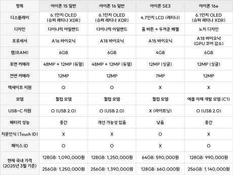 먼저 아이폰 16e의 경쟁 모델이라 할 수 있는 아이폰 15, 아이폰 16, 아이폰 SE3와의 차이점을 간단하게 알아보겠습니다.