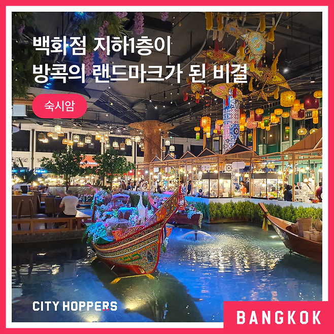 숙시암은 로컬 시장을 백화점 푸드코트로 구현했어요. 면적만 무려 15,000㎡, 4,500평이 넘는 규모예요. 컨셉을 야시장으로 잡고 흉내만 낸 정도가 아니라, 야시장을 통째로 옮겨 놓았죠. 어느 정도 스케일인지 함께 가볼까요? 참고로 방콕의 랜드마크로 자리매김했을 정도예요.