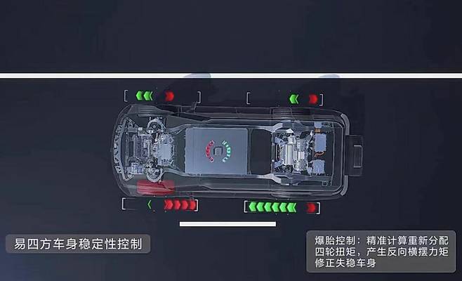 4개의 모터를 사용하는 만큼 구동 배분이 한층 유연하다. 기계식 4륜 구동 시스템보다 100배 빠르게 반응할 수 있고 20배 유연한 구동 배분이 가능하다. 여기에 각각의 바퀴를 제어해 제자리에서 회전할 수 있는 탱크턴, 후륜 조향 기능을 활용해 사선으로 주행하는 크랩주행도 할 수 있다.