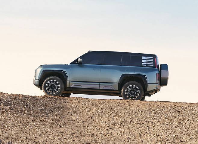 측면부는 각진 대형 SUV라는 점을 보여준다. 루프라인과 휠 하우스 모두 사각형 형태를 갖는다. 로커패널 하단은 스키드 플레이트 디자인으로 강인한 이미지를 표현했다. 휠은 20인치가 기본이며 275/60 R20 사이즈의 올 터레인 타이어를 사용한다.