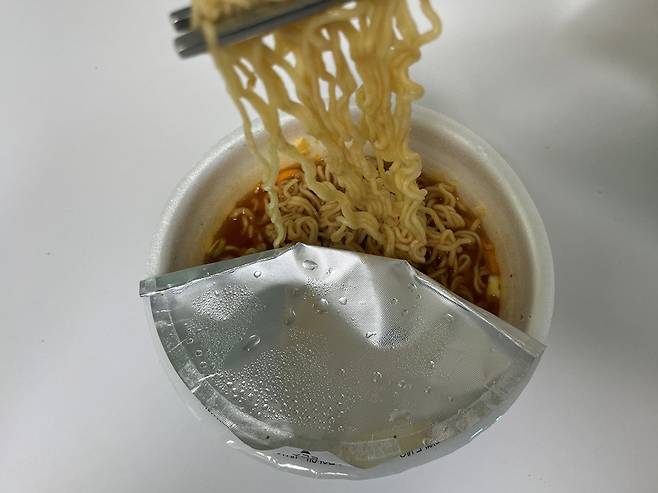 컵라면 뚜껑을 앞접시로 활용하니 따로 그릇을 꺼낼 필요가 없어서 좋습니다. 특히 야외에서 라면을 먹을 때 앞접시로 활용할 수 있으니 정말 편리합니다.