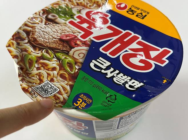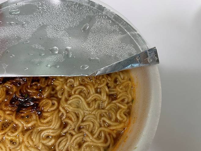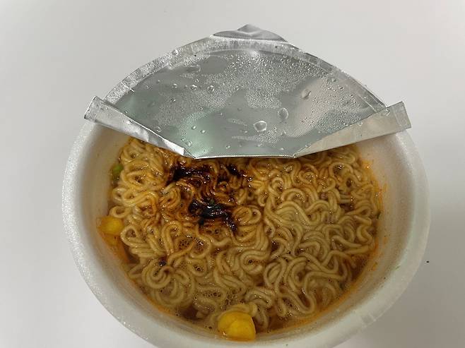 컵라면은 평소대로 스프를 넣은 후 물을 부어 익혀주세요. 뚜껑은 조리법 설명에 나오는 것처럼 표시선까지만 뜯으세요.