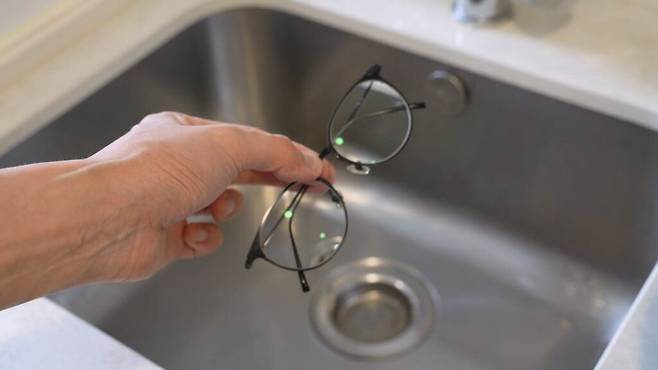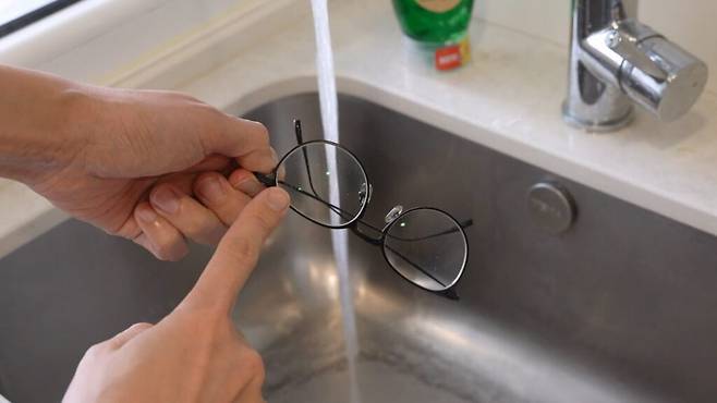 비눗물에 씻은 안경은 다시 찬물에 깨끗하게 헹궈 주세요. 잔여 비눗물이 남지 않도록 물에 헹궈 주시면 돼요.