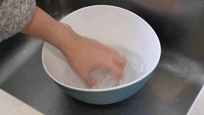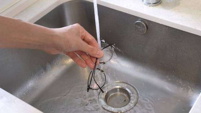 안경을 닦을 땐 뜨거운 물을 사용하면 안 돼요. 뜨거운 물이 닿을 경우 안경테, 안경 렌즈가 쉽게 손상될 수 있습니다. 그래서 반드시! 찬물을 사용하셔야 해요. 대야에 찬물을 적당하게 받아 놓으세요.