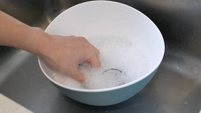 대야에 찬물을 넣어 주방세제를 적당하게 넣으세요. 그리고 손으로 거품이 풍성하게 나올 수 있도록 여러 번 저어 주세요. 손이 시리다면 거품기를 이용해 저어 주셔도 좋아요.