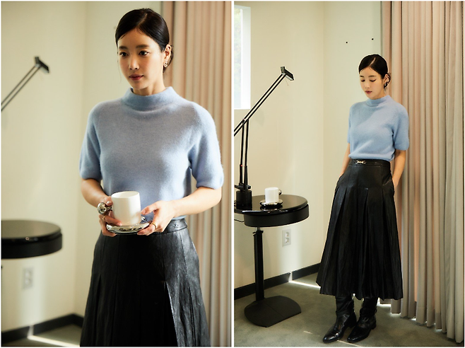 5. 라쿤 반팔 니트 / 레더 플리츠 스커트
