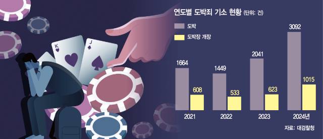 12일 대검찰청에 따르면 도박장 개설 혐의로 재판에 넘겨진 사건(약식기소 포함)은 지난해 1015건으로 2023년(623건)보다 2배 가까이 늘었다. 2020년만 해도 도박장 개설 혐의로 기소된 사건은 한 해 463건에 불과했다. 그러나 지난해 1000건을 넘는 등 최근 5년 내 급격히 증가하고 있다. 형법상 도박 혐의로 재판에 넘겨진 사건도 지난해 3092건을 기록하며 2023년(2041건)보다 1000건 이상 급증했다. 도박죄로 재판에 넘겨진 사건은 2020년 2741건에서 2021~2022년 다소 줄었으나 2023년 이후 다시 증가세로 돌아섰다.
