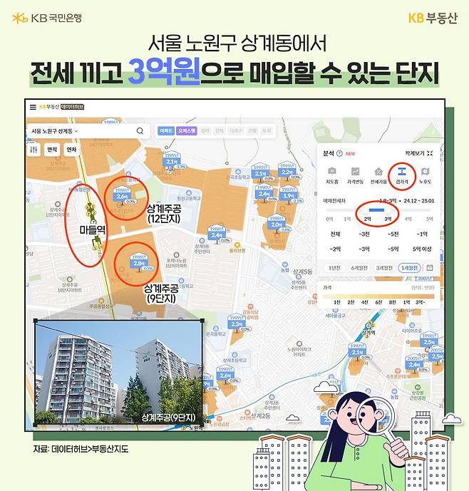 서울 노원구 상계동 지하철 7호선 노원역~마들역 주변에서 조건에 맞는 단지를 찾아보니, 상계주공(9단지)와 상계주공(12단지)가 각각 2억8,000만원, 2억6,000만원에 전세 끼고 매입할 수 있다고 나옵니다. 부동산지도에서 위치를 움직여 조건에 맞는 단지를 쉽게 찾을 수 있는데요. 개별 면적별 아파트를 찾고 싶다면, 투자테이블 코너로 가면 됩니다.