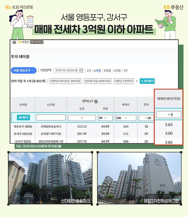 새해를 맞아 자산 리모델링을 다시 짜다 보니 문득 이런 생각이 들었습니다. ‘만약 3억원이라는 목돈이 생긴다면, 어디에 아파트를 사는게 좋을까?’라는 기분 좋은 상상인데요. 매매가 대비 전세가 차액이 3억원 이하인, 서울에서 괜찮은 아파트를 찾고 싶다면 어디서부터 시작하는 것이 좋을까요? KB부동산이 알려드립니다.