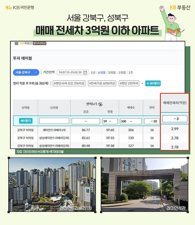새해를 맞아 자산 리모델링을 다시 짜다 보니 문득 이런 생각이 들었습니다. ‘만약 3억원이라는 목돈이 생긴다면, 어디에 아파트를 사는게 좋을까?’라는 기분 좋은 상상인데요. 매매가 대비 전세가 차액이 3억원 이하인, 서울에서 괜찮은 아파트를 찾고 싶다면 어디서부터 시작하는 것이 좋을까요? KB부동산이 알려드립니다.