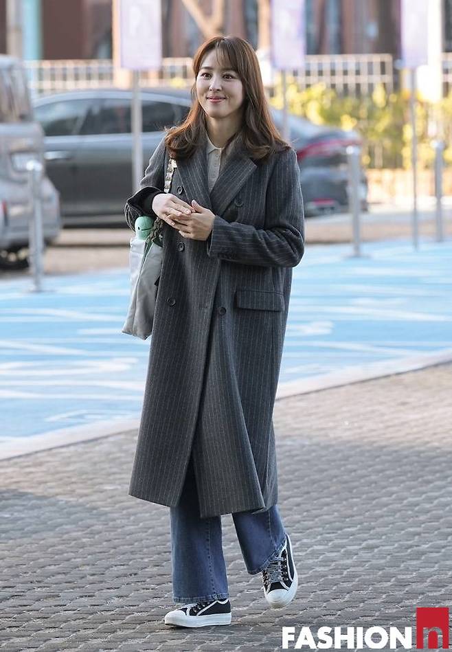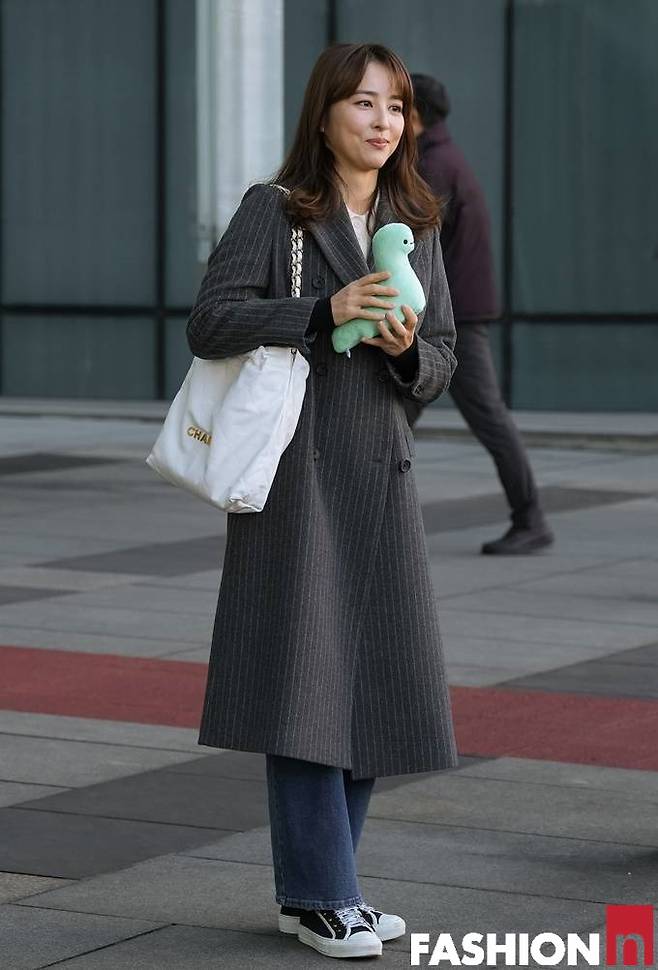 배우 한혜진은 핀 스트라이프 롱 코트에 인형을 든 출근룩으로 소녀감성을 드러냈다.