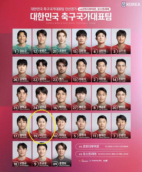 오랜기간 등번호 18번을 달았던 이강인은 지난해 10월 브라질, 파라과이와의 국내 A매치 친선전 2연전에서 등번호 19번으로 바꿔달았다. 28일 코트디부아르, 4월 1일 오스트리아전 2연전에도 19번을 달고 뛴다.